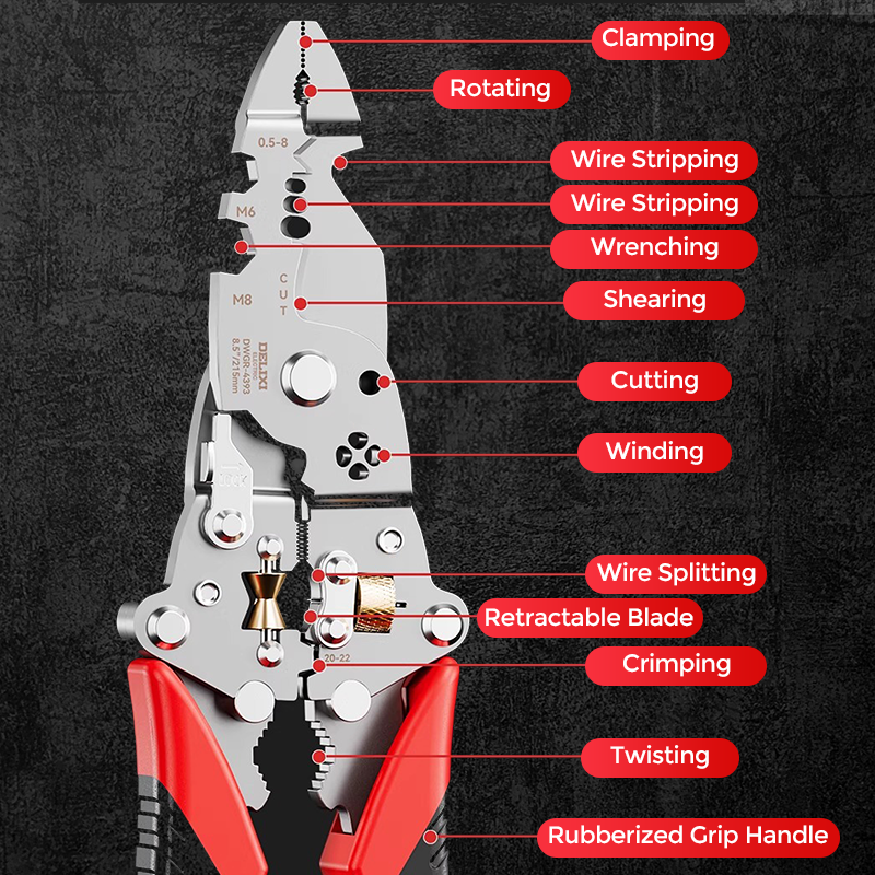 MULTIFUNKTIONALES 16-IN-1-WERKZEUG: Kombiniert Abisolieren, Schneiden, Spalten, Schrauben, Rohrbiegen und vieles mehr – ideal für verschiedene elektrische und mechanische Aufgaben.